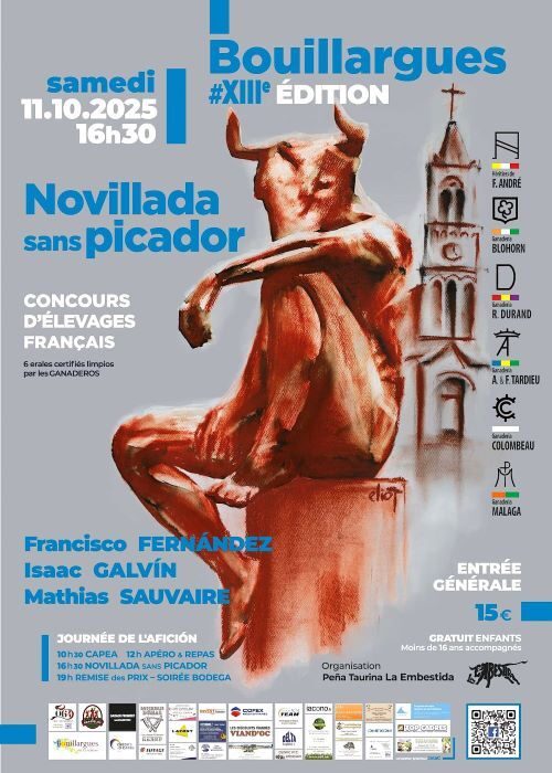 La Pena Taurina La Embestida de Bouillargues est heureuse de vous annoncer le cartel complet de sa 13eme novillada sans Picadors. Elle aura lieu le Samedi 11 Octobre 2025 à 16h30 dans le cadre de sa traditionnelle journée de l’Aficion.