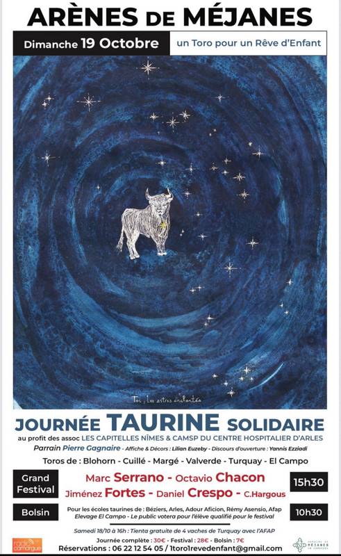 Marc Serrano a dévoilé l’affiche du festival « Un toro pour un rêve d’enfant » donné au profit des enfants malades qui se déroulera à Méjanes le dimanche 20 octobre prochain. Les bénéfices reviendront aux associations « Les Capitelles » de Nîmes et la CAMSP du centre hospitalier d’Arles. Le parrain de cette édition sera Pierre Cagnaire. Créateur de l’affiche et décor : Lilian Euzeby. Discours d’ouverture : Yannis Ezziadi
