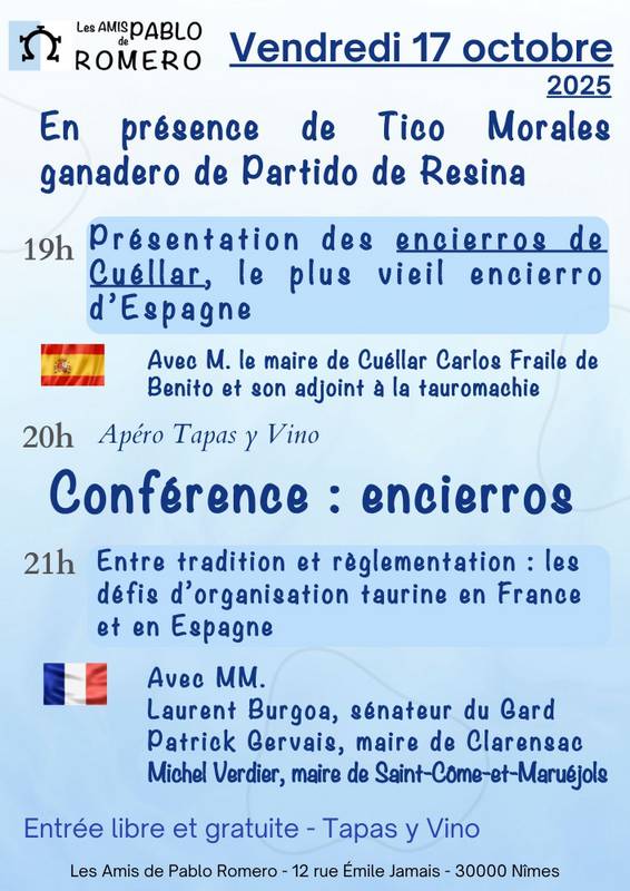 Le vendredi 17 octobre à partir de 19h le monde taurin se donne rendez-vous à la bodega les Amis de Pablo Romero pour une rencontre exceptionnelle sur les encierros ; entre tradition et réglementation : les défis des manifestations taurines en France et en Espagne.