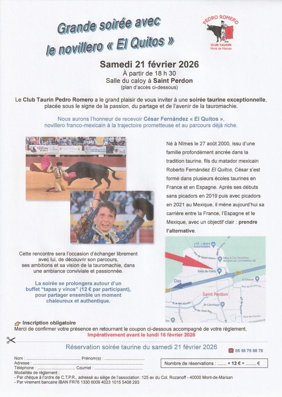 Le Club Taurin Pedro Romero a le plaisir de vous inviter à une soirée taurine qui promet d’être conviviale avec la venue du novillero Cesar Fernandez » El Quitos ».