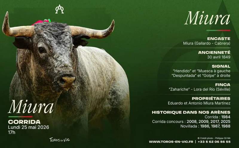 Enfin, c’est un événement historique pour les arènes de Vic. La légendaire ganaderia de Zahariche, MIURA, fera son retour en corrida complète après 42 ans d’absence, la dernière corrida de ce fer ayant été lidiée en 1984.